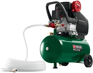 A base do conjunto, e o equipamento mais dispendioso, com um preço de 119.99 Euros, é, naturalmente, o compressor Parkside, equipado com um motor lubrificado, silencioso e sem vibrações, com uma potência de 1.8 kW ou 2.45 Hp, o que permite debitar até 260 litros por minuto e dispor de uma potência máxima regulável até aos 8 bar, incluindo ainda dois manómetros com escala em bar e PSI.