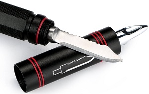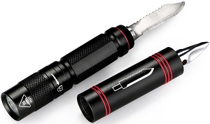 Esta lanterna, para além da sua funcionalidade nativa de iluminação, inclui uma ponta de alta resistência, capaz de partir vidros, e, no seu interior, uma lâmina, com serrilha do lado oposto, que pode cortar cintos de segurança, pelo que a sua utilidade no interior de uma viatura poderá ser interessante.