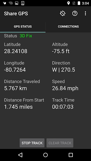 O écran de estado inclui os dados principais de navegação provenientes do GPS, incluindo coordenadas, altitude, velocidade e direcção, distância percorrida desde o início e tempo dispendido, sendo possível partilhar esta informação, nas unidades pretendidas, via área de transferência, ou "clipboard".